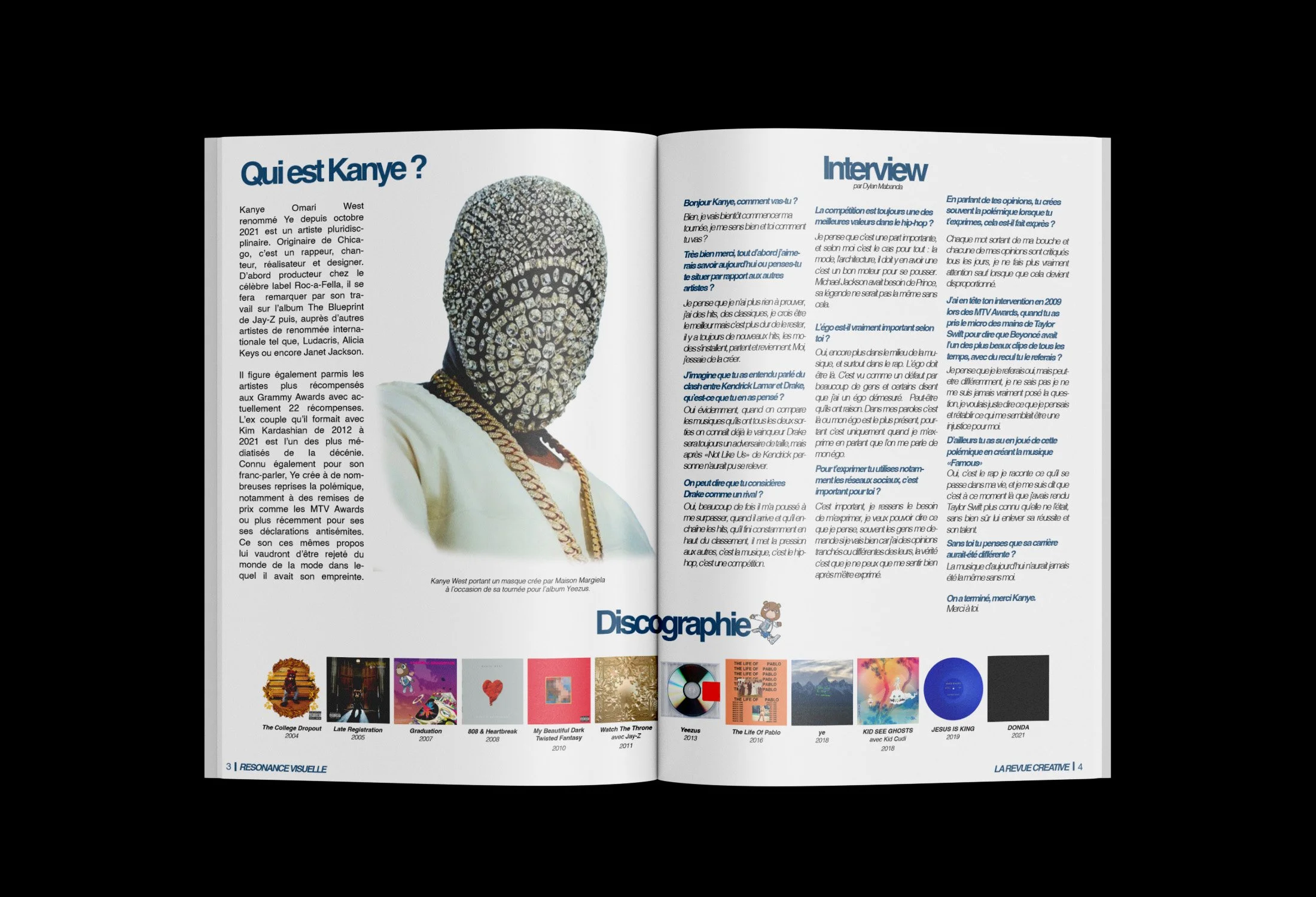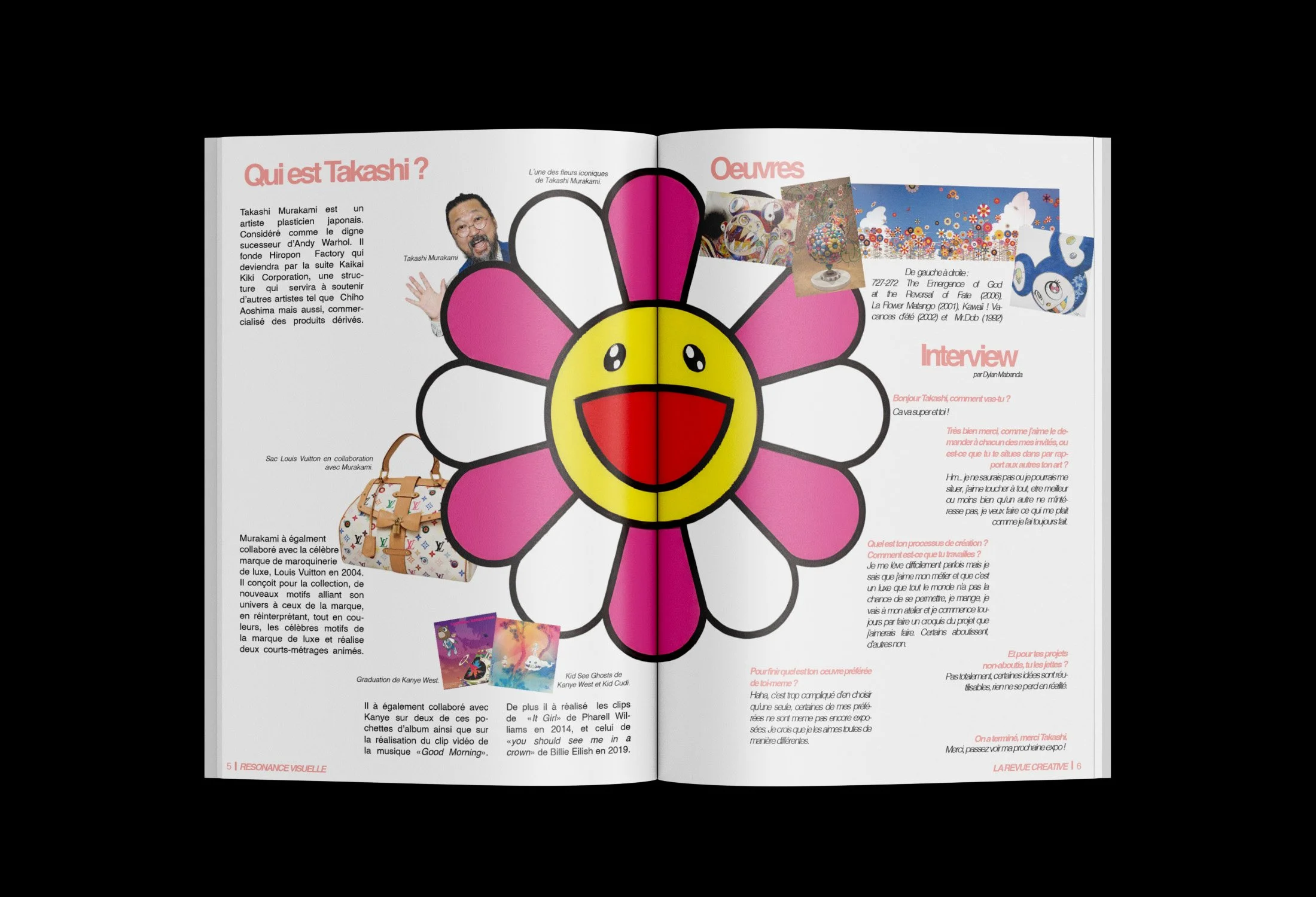Résonance Visuelle is an art-focused magazine concept. For this project, I chose to feature two iconic figures on the covers: Takashi Murakami for the front cover and Kanye West for the back cover.